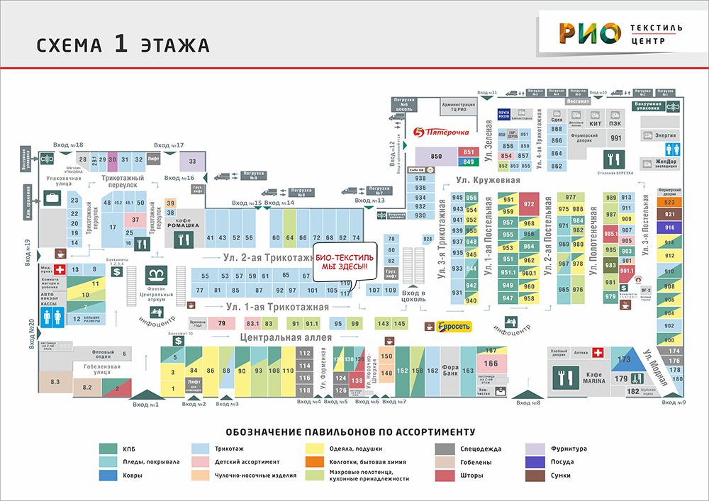 Павильон 117 находится на 1 этаже текстильного центра РИО, по улице 1-я Трикотажная.