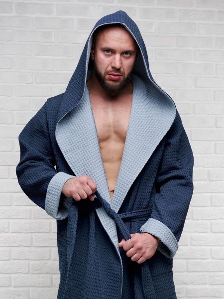 Халат вафельный с капюшоном, два цвета, темно-синий