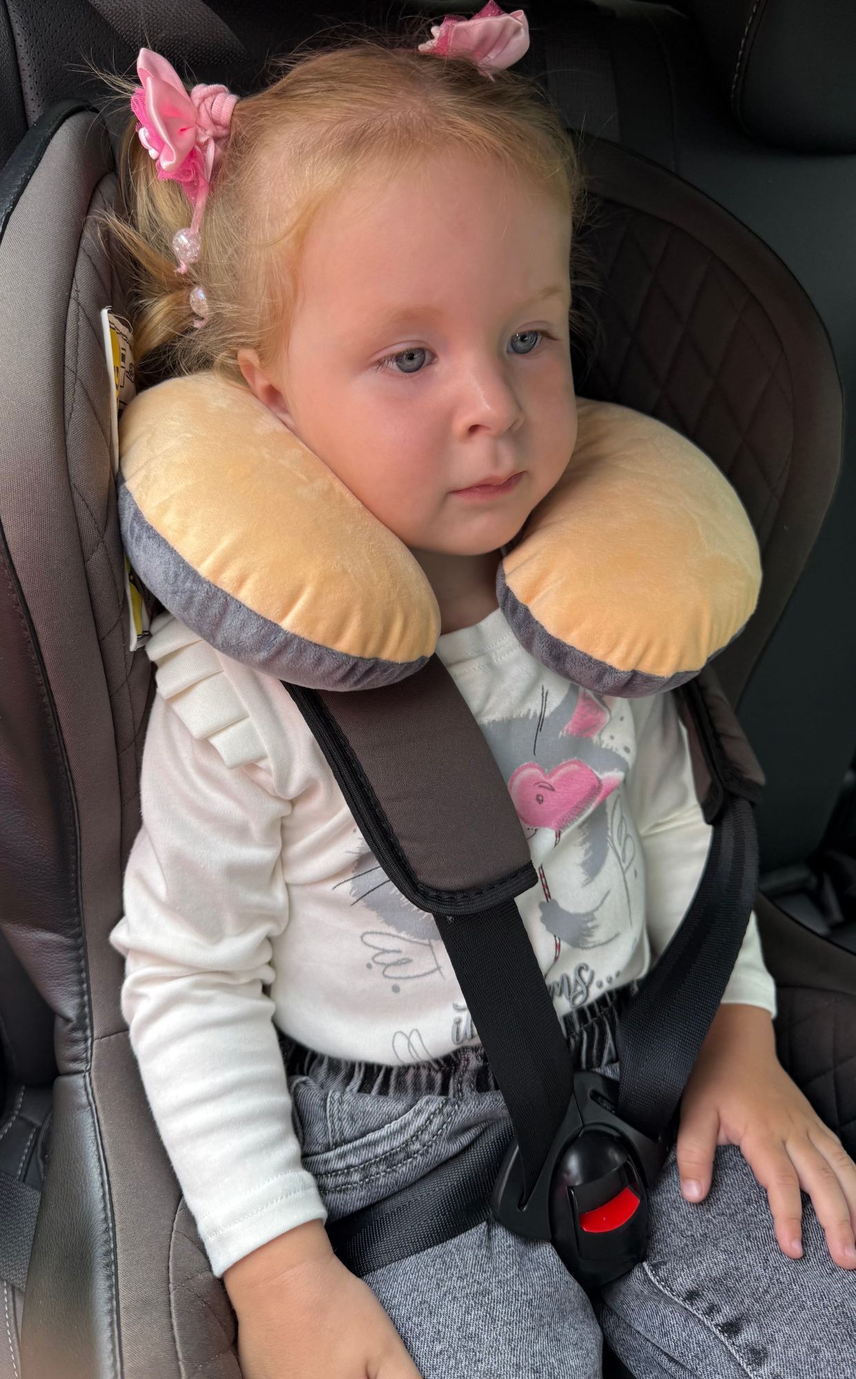 Эта подушка обеспечит вашему ребёнку комфортный сон во время поездки. Её форма в виде рогалика поддерживает голову и шею, предотвращая их затекание во время сна в автомобиле.