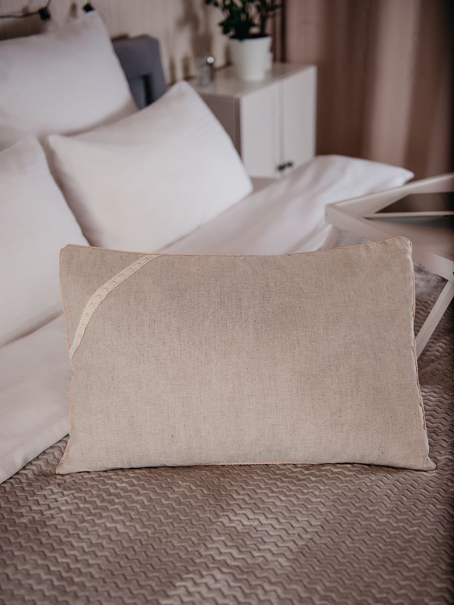 К комплекту с подушкой прилагается льняная наволочка на молнии.