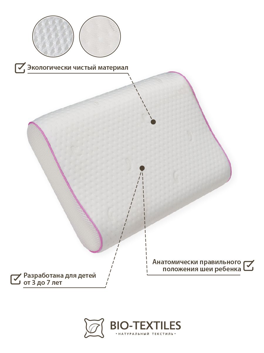 Подушка поддерживает шею ребенка, обеспечивает правильное положение грудного и шейного отдела позвоночника во время сна.