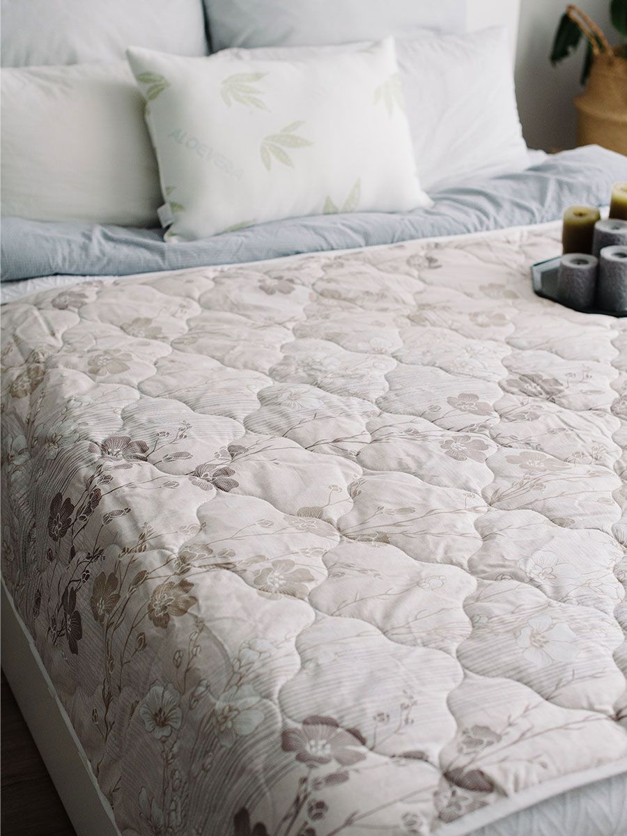 Одеяло ЛЁН выполнено из хлопковой ткани и простегано тонким льняным волокном, с добавлением синтетического. Это обеспечивает хорошую воздухопроницаемость и прочность.