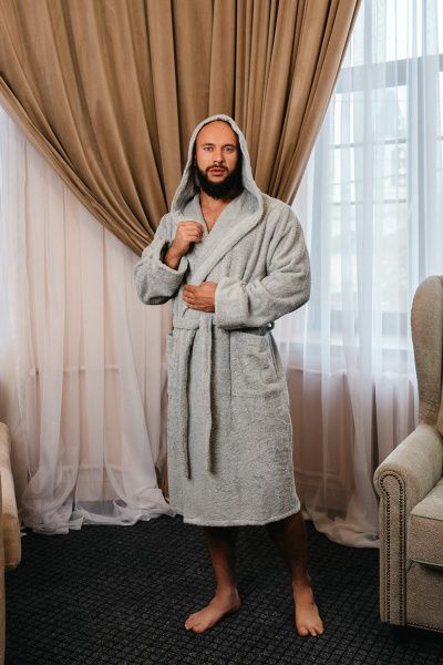 Модель халата с поясом позволяет ему быть универсальным и подходит к любому типу телосложения, скрывая недостатки и подчеркивая достоинства фигуры. Наличие карманов делает его практичным для ношения дома, в бане или сауне, а также на отдыхе.