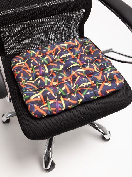 Подушка на стул в красочном дизайне создана специально для детей, преимущественно школьного возраста, так как при выполнении домашних заданий им сложно сохранять правильную осанку. Наполнитель из лузги гречихи обладает ортопедическими свойствами и придает подушке необходимую жесткость. Такая подушка за счет своей формы и особенностей наполнителя очень полезна для правильного развития опорно-двигательного аппарата, хорошего кровообращения при долгом сидении.