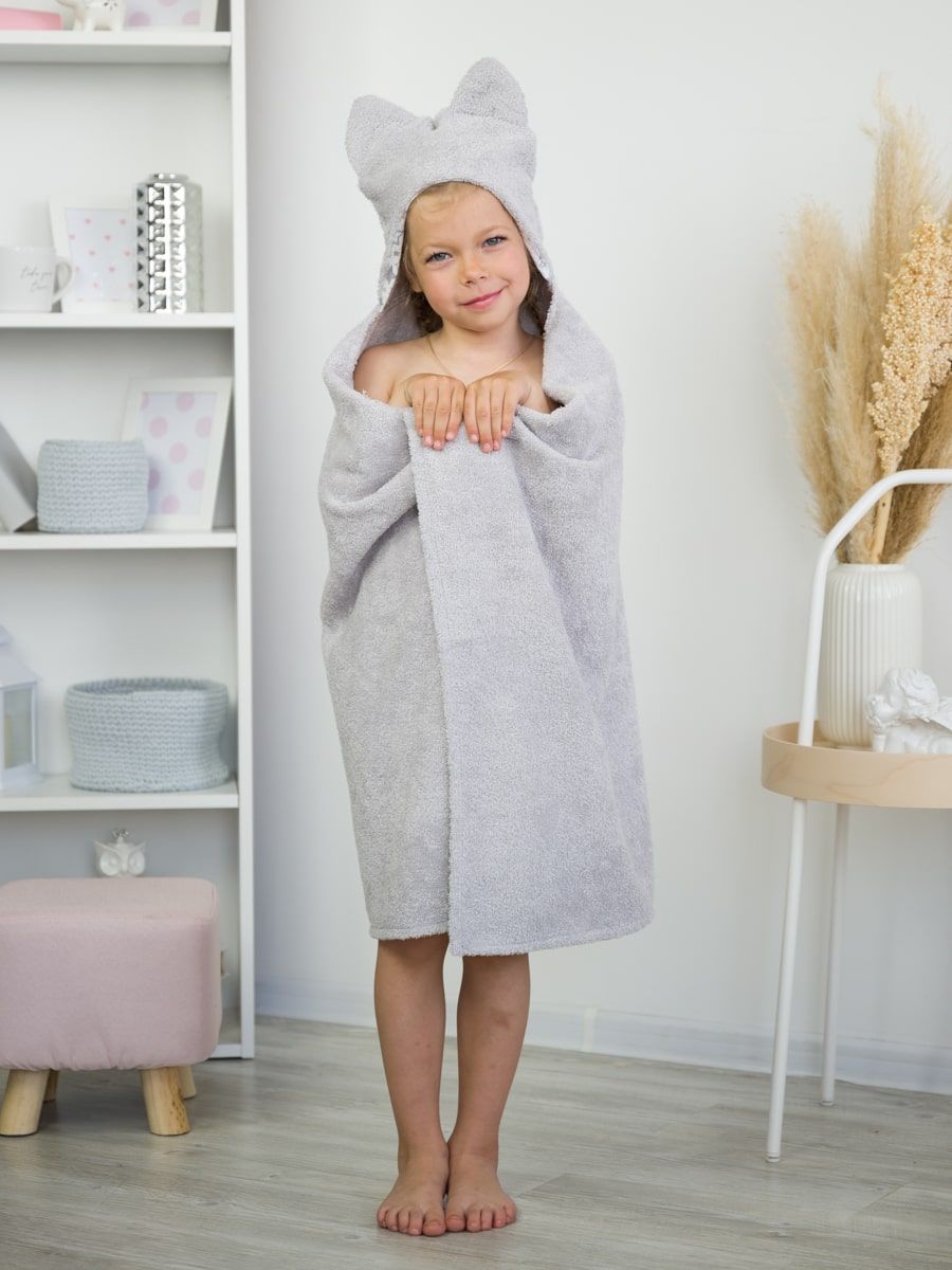Большое полотенце с ушами кота станет незаменимым аксессуаром после купания как для новорождённых малышей, так и для подросших девочек ростом до 120 см.