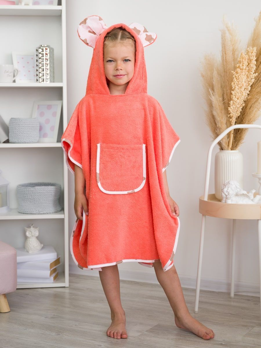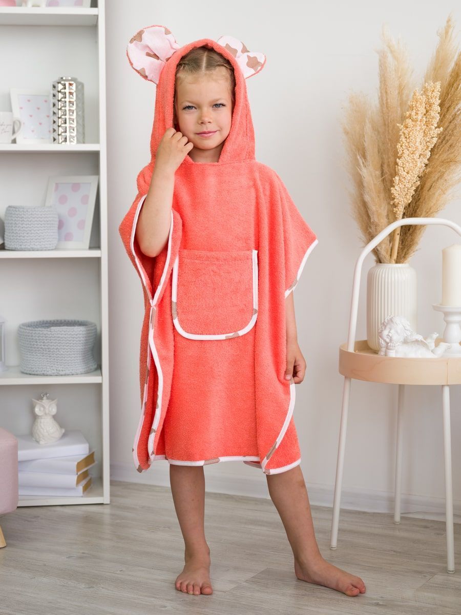 Пончо для детей станет интересной альтернативой банному полотенцу или домашнему халату после купания, для посещения сауны или бассейна. Капюшон с ушами мышки, вместительный фронтальный карман и контрастная бязевая отделка делают модель максимально удобной и ещё более стильной.