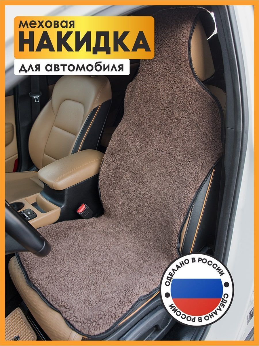 Меховая накидка на кресло автомобиля коричневая, с накладкой на подголовник 2018/коричневый