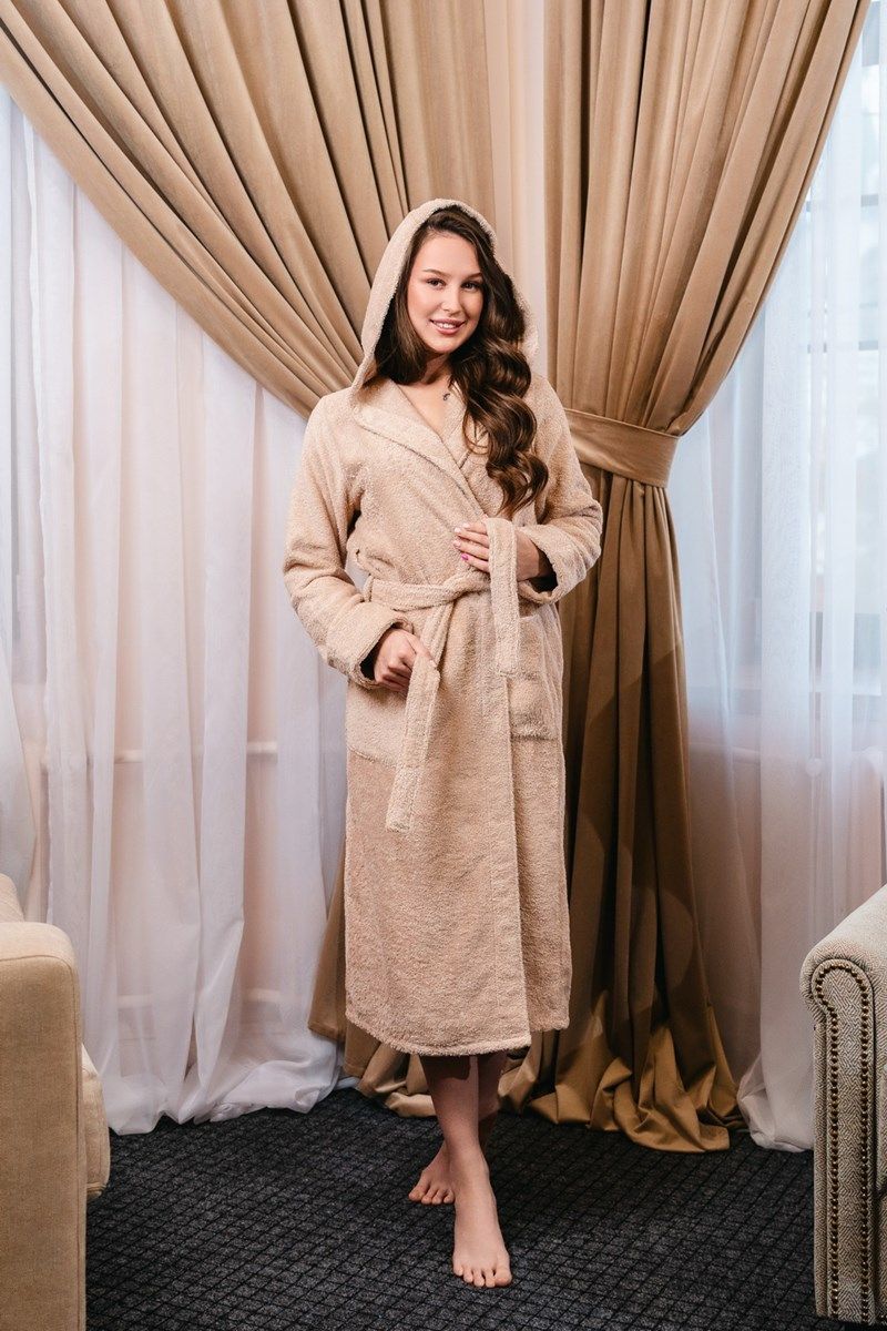 Халат махровый женский с капюшоном бежевый