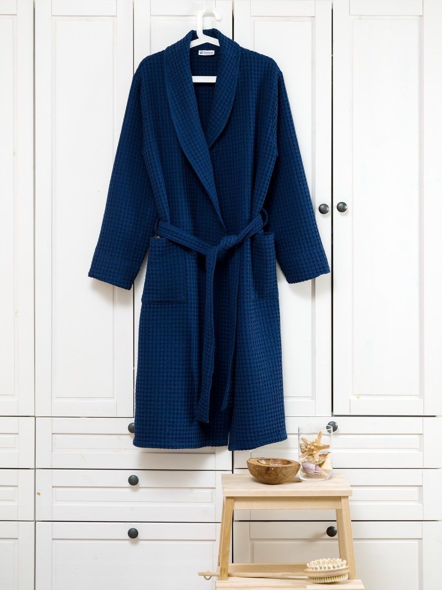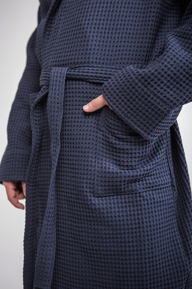 Халат достаточно легкий, а мелкие квадратики вафельной ткани создают воздушную подушку между халатом и кожей, за счет чего сохраняется комфортная температура тела, а после водных процедур кожа быстрее высыхает.