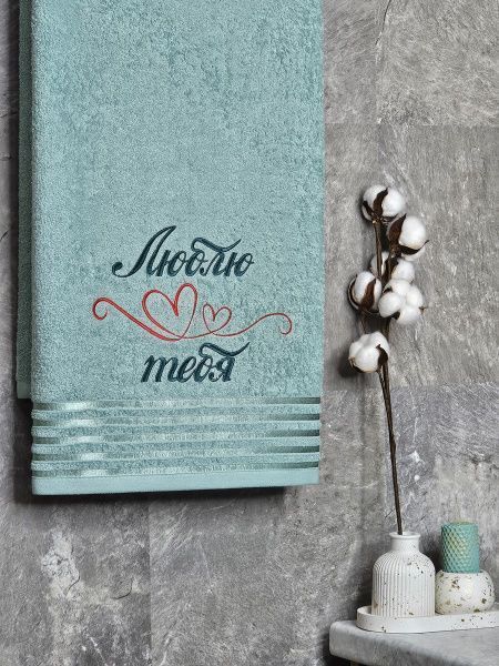 Полотенце с вышивкой 70*140 "люблю тебя" зеленое с бордюром